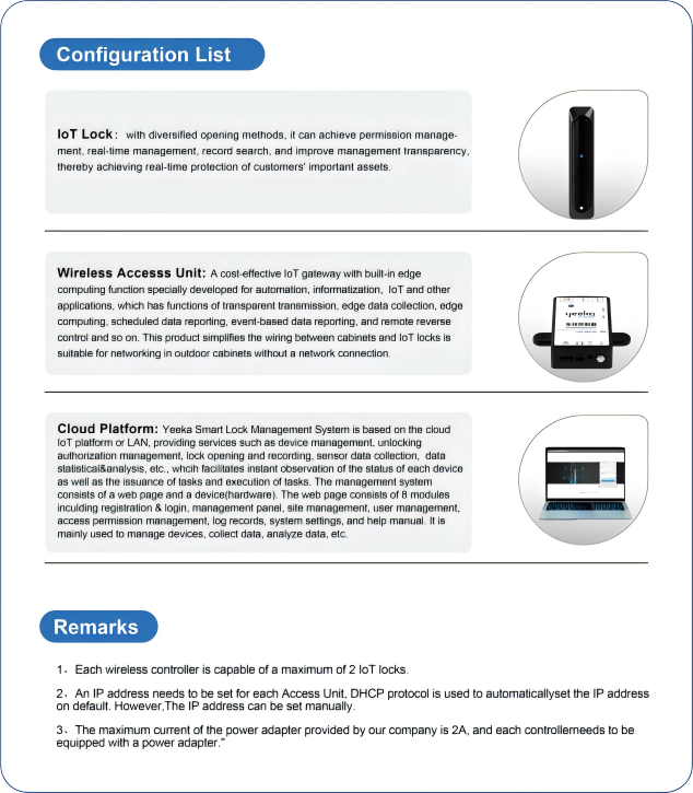 • Deploy an intelligent management platform to support remote monitoring, role-based access control, and unlocking record traceability